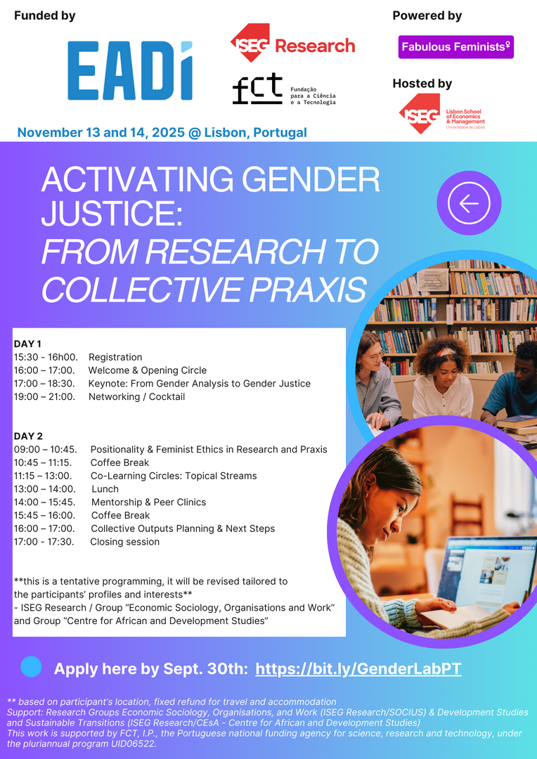 Join us for a transformative one-and-a-half-day event in Universidade de Lisboa's Instituto Superior de Economia e Gestão, that brings together early-career and senior researchers, practitioners, and activists working on gender justice issues in the Global South. This event will focus on advancing intersectional and transformative understandings of gender within Development Studies but at the same time, we want to build a strong and proactive community of researchers for future spaces such as the EADI Annual Conference in July, 2026, in Antwerp, Belgium.